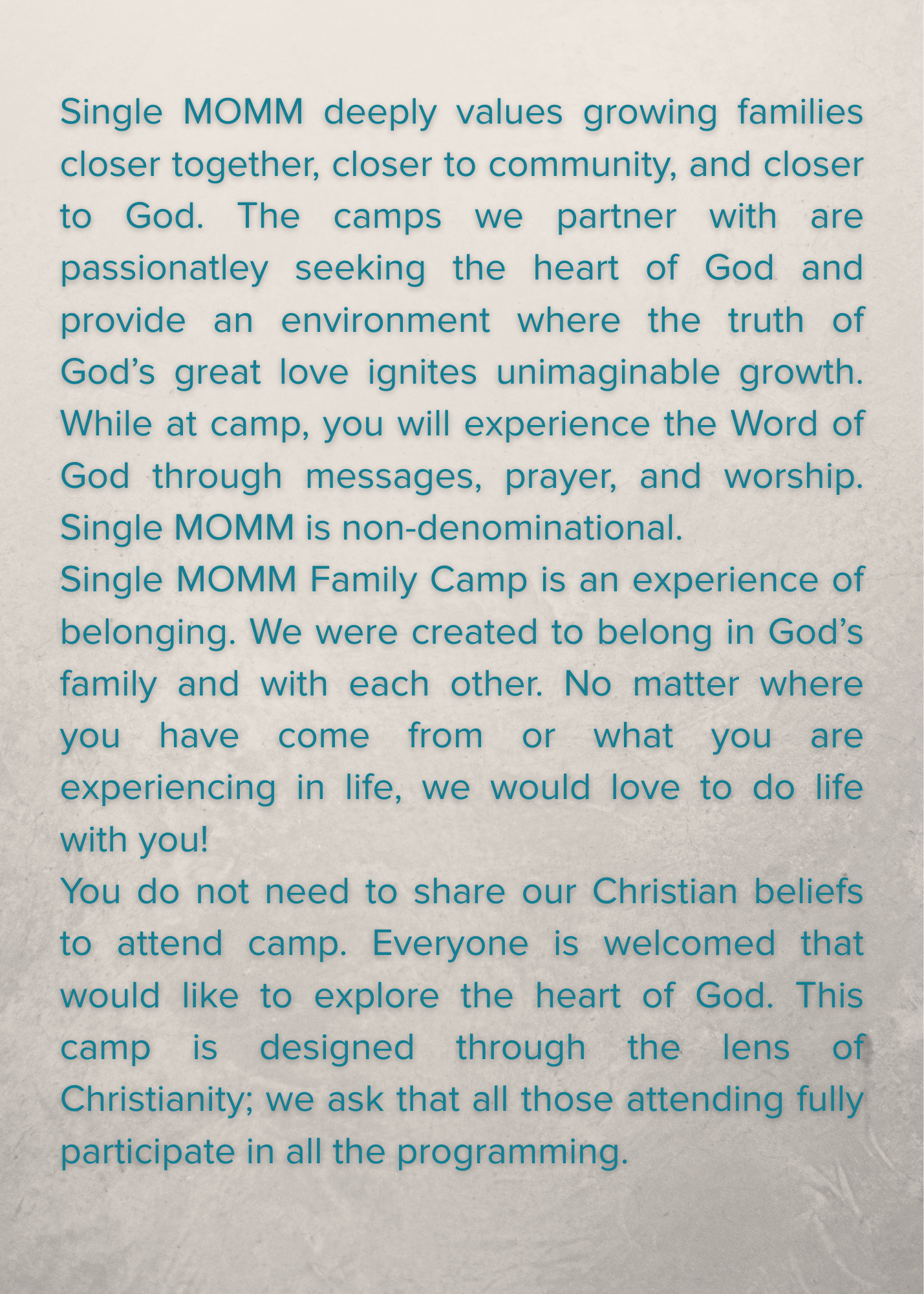 Camp doesn’t end on the last day. Single MOMM is a community that does life together. After camp, you will be invited to gatherings, events, and mentorship.